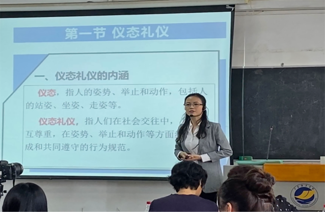 第一位参赛选手刘霞以《秘书社交礼仪》课程拉开了此次竞赛的序幕。她通过3个案例分析了仪态礼仪的内涵和要求,并邀请员工进行规范的站姿、坐姿、走姿和蹲姿示范。在授课过程中刘霞积极与员工互动,注意调动课堂气氛,教学目标达成度较高,得到了评委会的充分肯定。