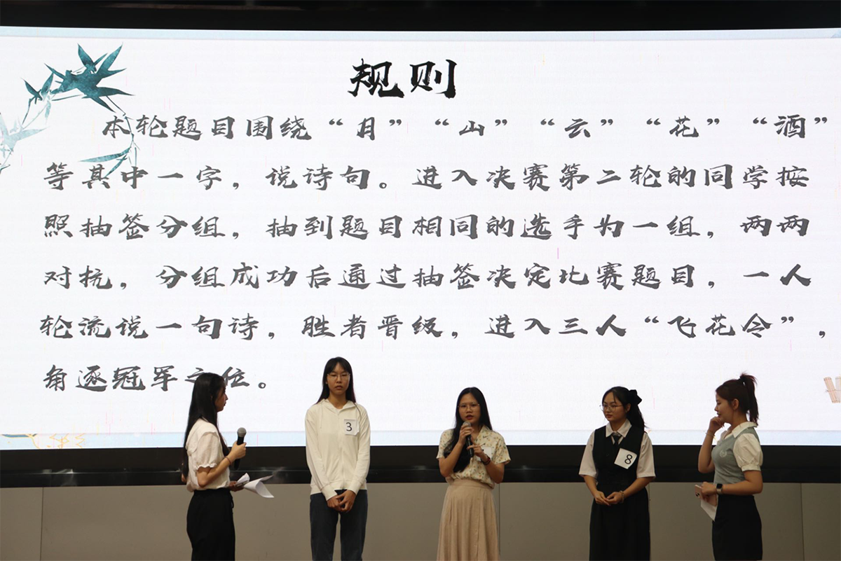 本次古诗词大会分为初赛和决赛两个部分:初赛以线上答题形式考察员工对古诗词知识的积累,共有300多名员工参加,最后前12名晋级决赛;决赛分为诗词接龙抢答和“飞花令”冠军争夺赛两轮,诗词接龙抢答后,共有6名选手进入“飞花令”冠军争夺赛。选手们腹笥丰盈、敏捷如电,精彩表现赢得掌声不断。最终,汉教1212班曹倩怡、汉教1222班余悦、汉教1211班程潆分别获得前三名,而曹倩怡、余悦作为校赛前两名选手,将代表公司参加“2024中国诗词大会”广东省选拔赛。