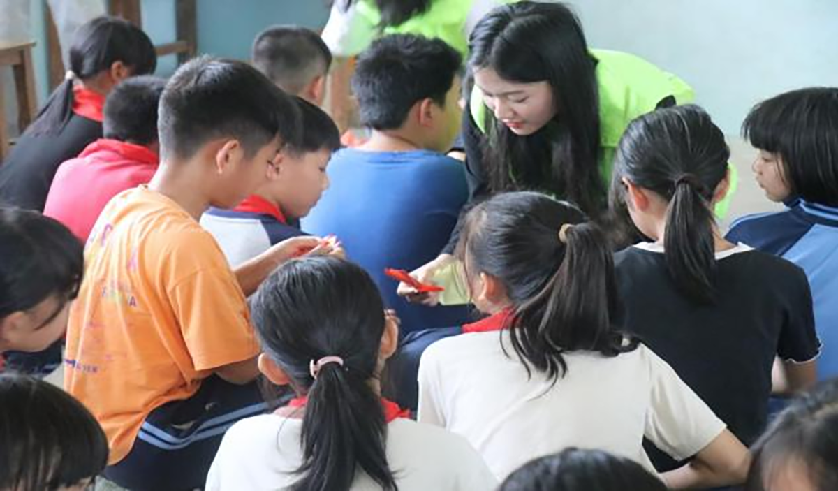 ,此次活动共设两个环节,第一个环节是学古诗识花卉,第二个环节是学习郁金香折纸和手势舞。志愿者们通过教小朋友们学古诗,引起他们对古诗中描写的多种花卉的兴趣,同时通过展示花卉实物图片,帮助小朋友们感知古人体物之深、摹写之工、传神之美,还通过有奖互动鼓励小朋友们积极参与。折纸和手势舞学习,同样注重调动孩子们动手参与的积极性,达到寓教于乐的目的。在指导小朋友们完成折纸后,志愿者们送上自己示范编织的向日葵花,希望小朋友们像向日葵一样向阳而生、健康成长。活动结束后,志愿者们给黄桐希望小学送上盆栽和笔记本,作为本次活动的纪念。