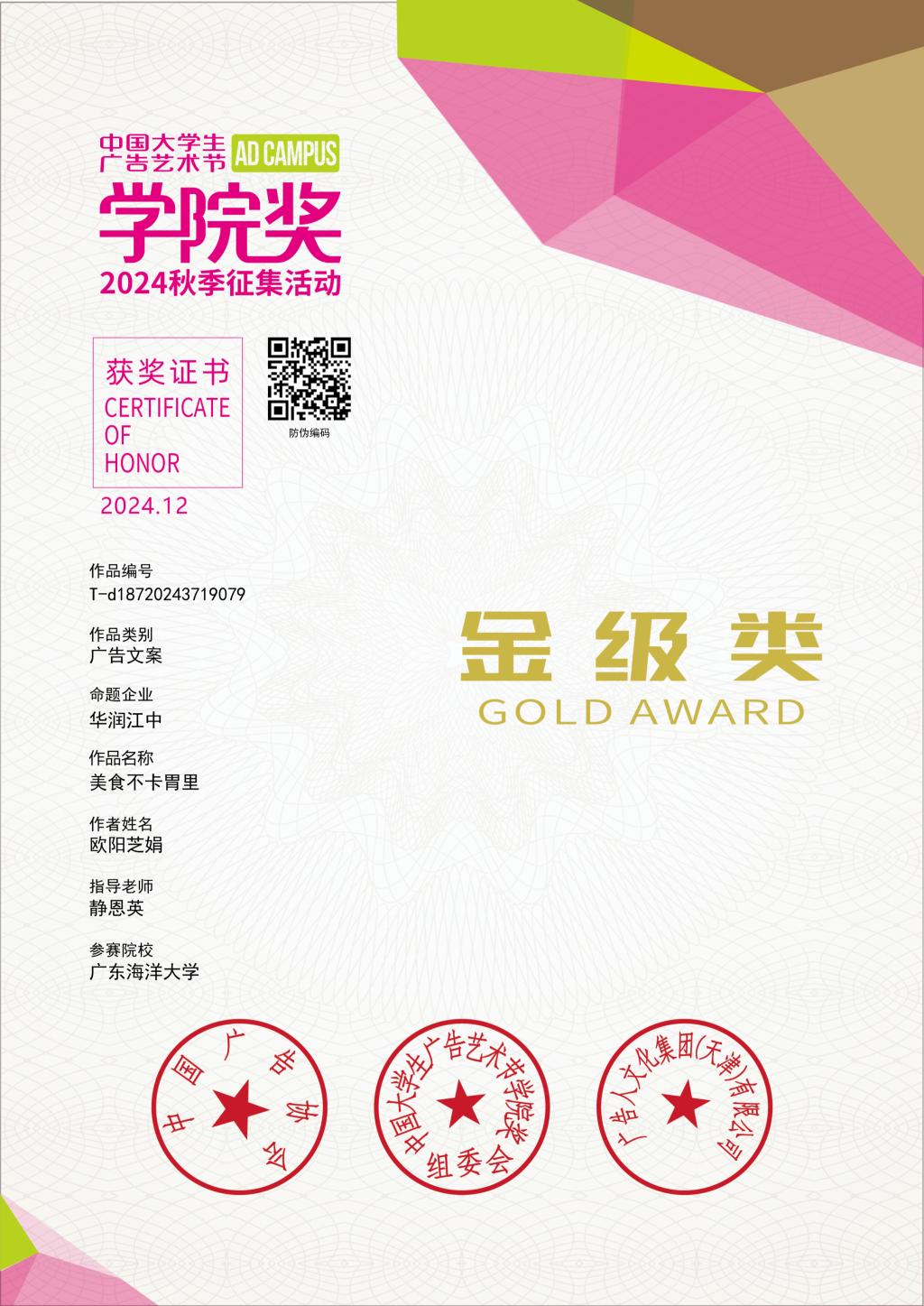 欧阳芝娟获奖证书 |