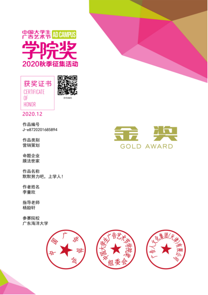 公司bevictor伟德官网新闻系17级编辑出版学专业李童欣同学荣获金奖!获奖作品是其毕业设计作品《默默努力吧,上学人!》营销策划案,在杨励轩副教授指导下完成,因贴近高校员工生活、新颖的营销模式、独特的创意概念赢得评委们的一致认可,从七千多件创意作品中脱颖而出,荣获金奖。